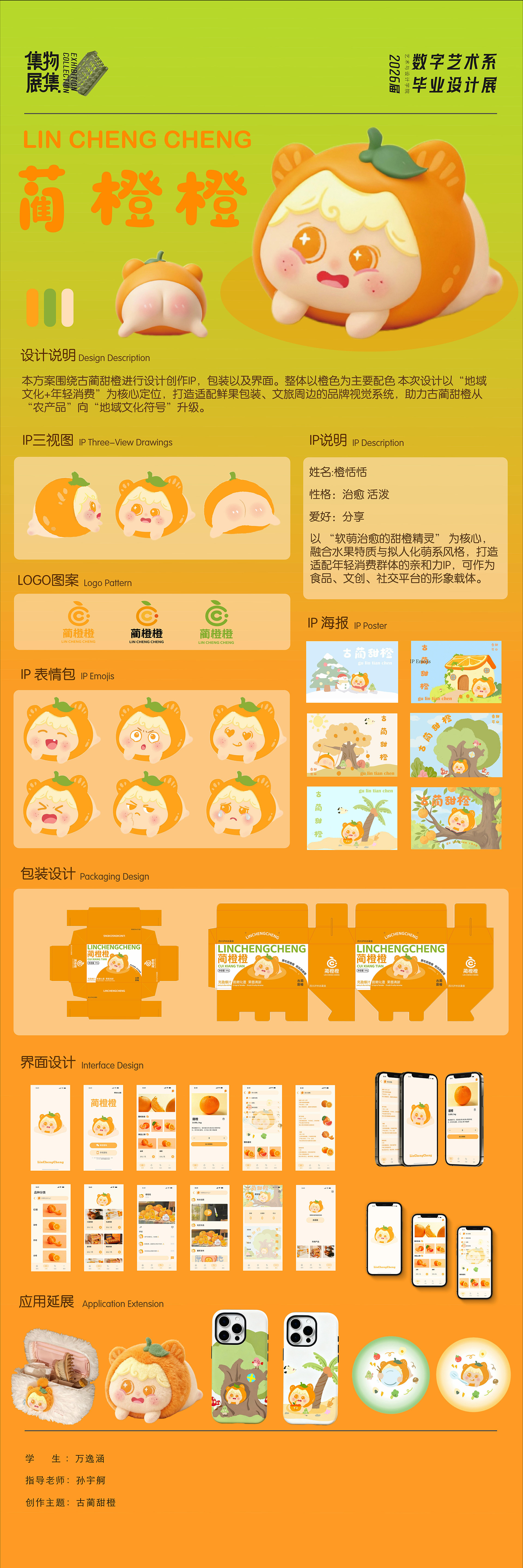本方案围绕古蔺甜橙进行设计创作IP,包装以及界面。整体以橙色为主要配色 本次设计以“地域文化+年轻消费”为核心定位,打造适配鲜果包装、文旅周边的品牌视觉系统,助力古蔺甜橙从农产品”向“地域文化符号”升级。